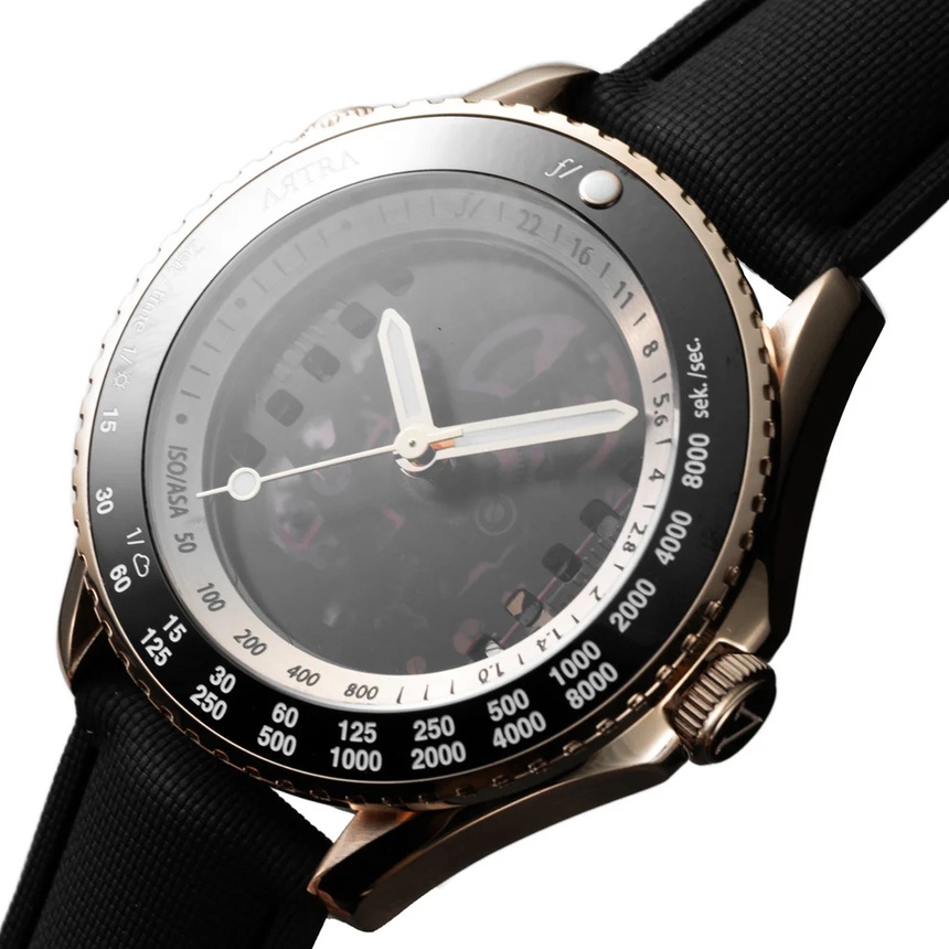Корпус выполнен из нержавеющей стали, стекло сапфировое. На безеле и корпусе расположены стилизованные шкалы диафрагмы, ISO и выдержки. Главная фишка часов — работающая механическая диафрагма, которая способна полностью закрыть циферблат-скелетон или открыть вид на внутренности механизма. Это очень эффектная деталь, подчёркивающая «фото-ДНК» устройства.