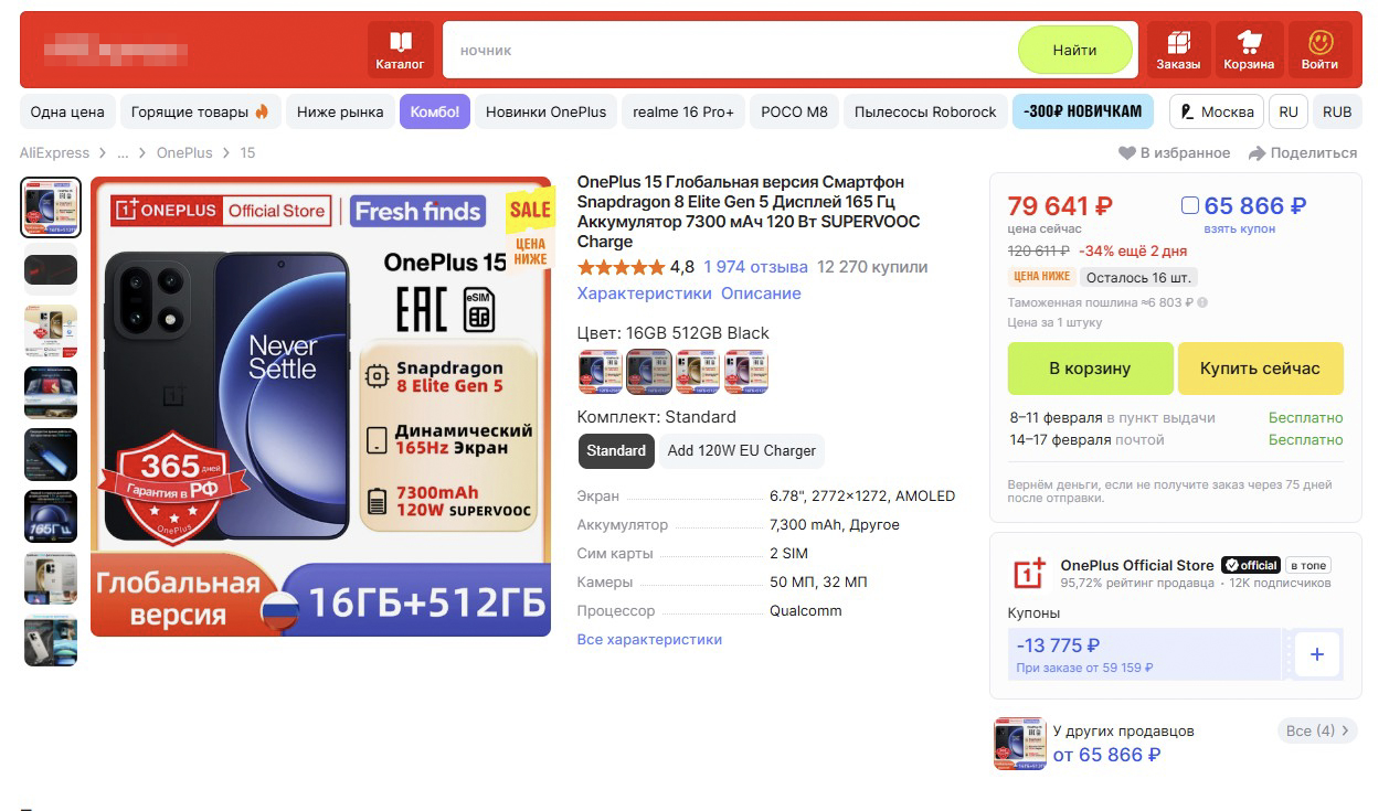 В качестве примера рассмотрим смартфон OnePlus 15. Вот страничка глобальной версии. Обратите внимание на стоимость: почти 80 000 рублей на момент написания статьи.