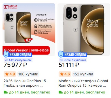 А вот такой же OnePlus 15, но почти на 25 000 рублей дешевле. На карточке товара написано уже не «глобальная версия», а «разблокированный смартфон». Стоит изучить комментарии к карточке товара, чтобы убедиться, что речь идёт о китайской версии смартфона. В данном случае термин «разблокированный» означает, что в этом устройстве снята региональная блокировка. Если ничего не написано, а смартфон стоит значительно дешевле, перед вами, скорее всего, китайская версия.