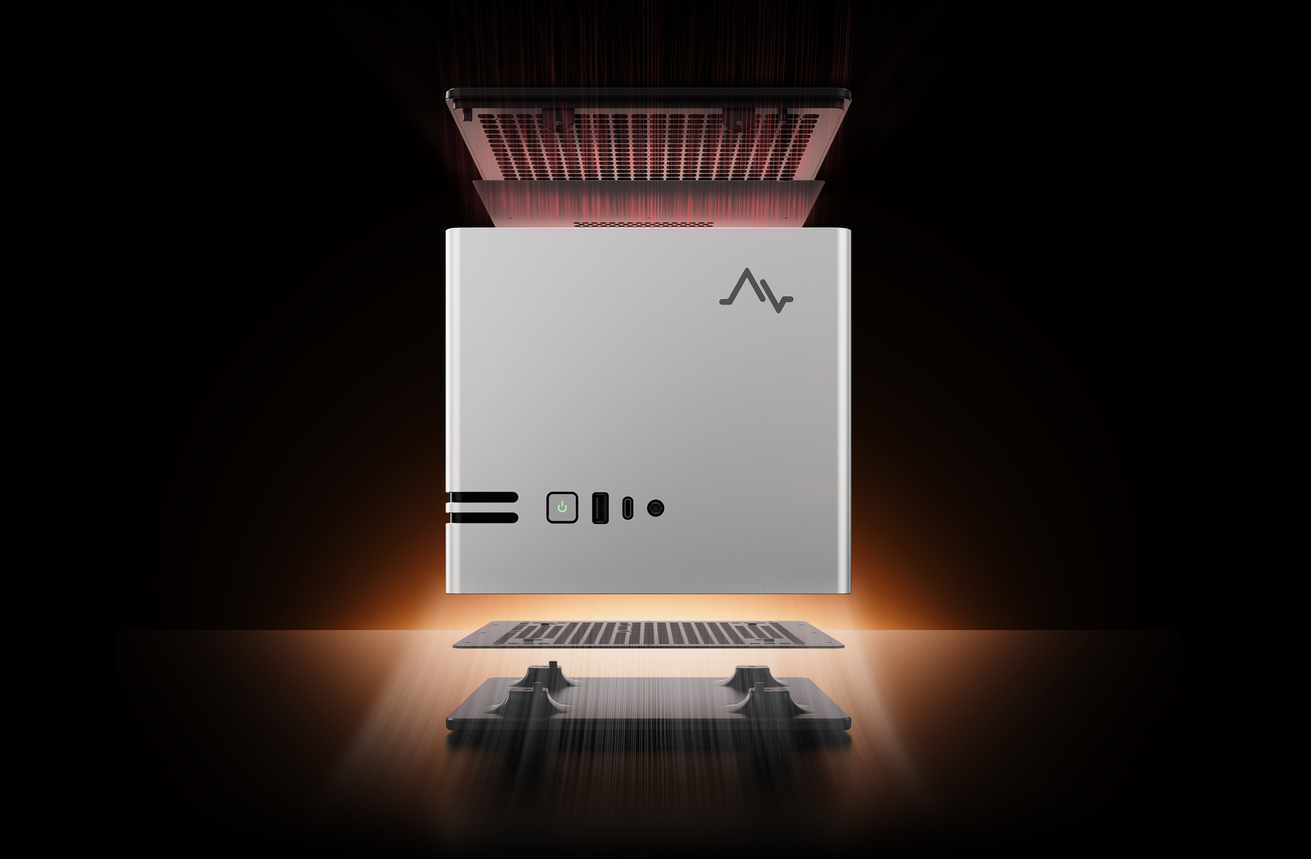 Maibeben PC95A выполнен в серебряном цвете. Корпус с каркасной основой изготовлен из цельнолитого алюминиевого сплава, что повышает устойчивость к деформациям и царапинам, а также обеспечивает эффективный отвод тепла. Габариты устройства составляют 199,3 x 199,3 x 199,3 мм.