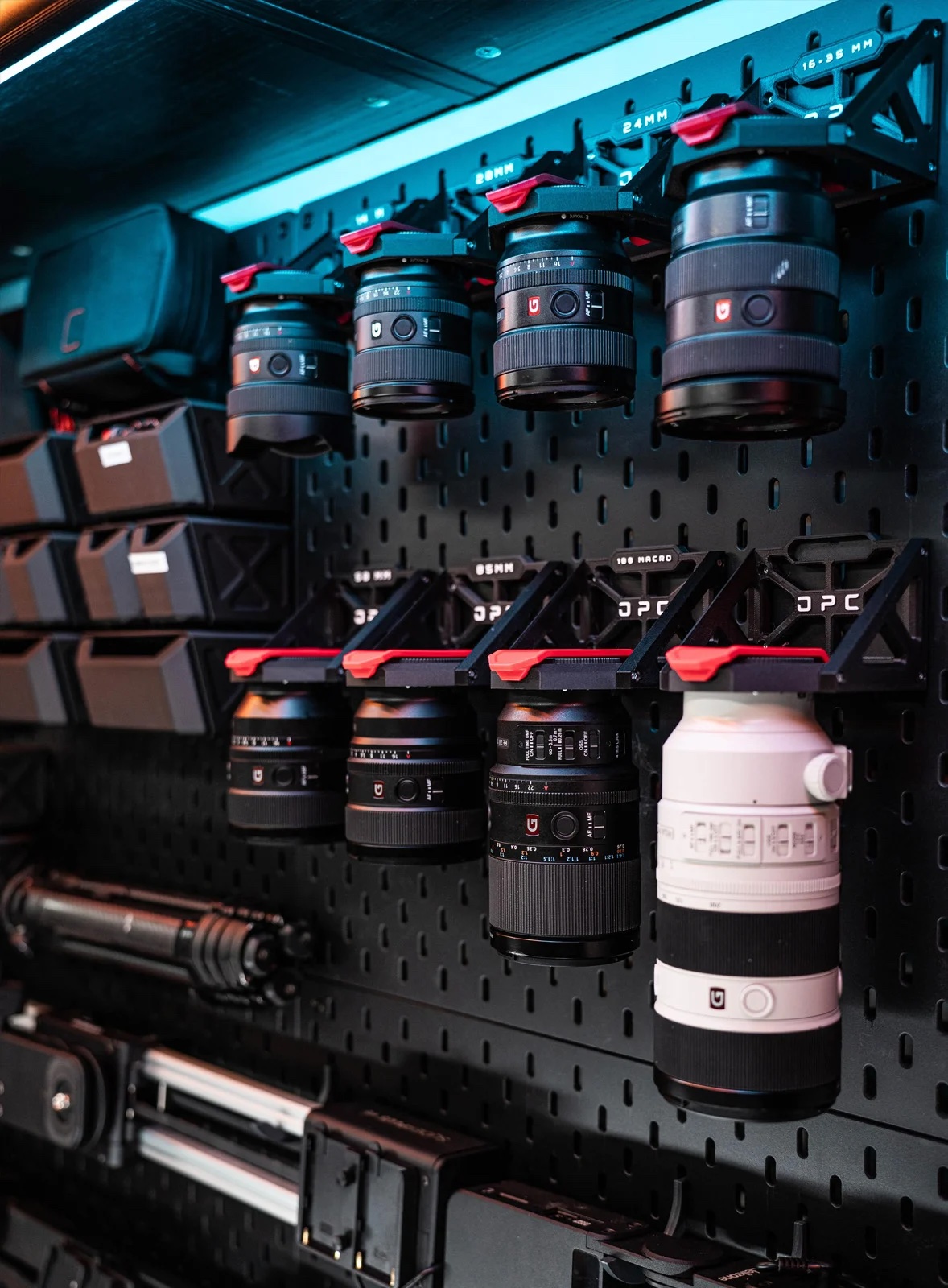 Интересный способ хранения объективов для провдинутых фотографов и студий предложила компания OPC. Речь о док-станции Lens Dock-E, созданной специально для объективов Sony.