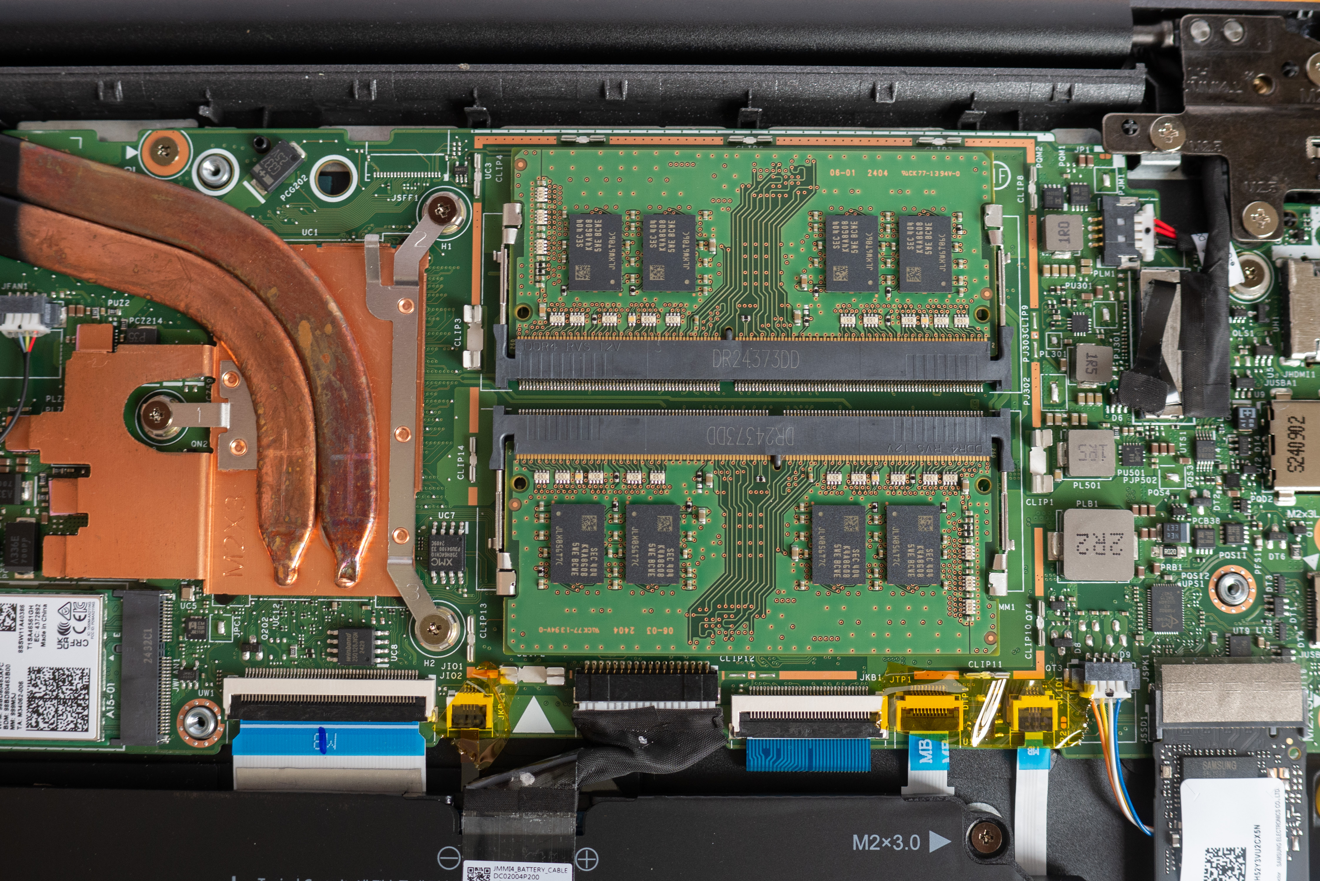 Оперативной памяти 16 ГБ. Она работает в двухканальном режиме, что повышает быстродействие системы. Модули оперативной памяти не распаяны на плате и позволяют проводить апгрейд ноутбука. Система поддерживает до 64 ГБ RAM. Встроенный накопитель на 512 ГБ. Поставить второй модуль не получится, можно лишь при желании заменить имеющийся на более ёмкий.