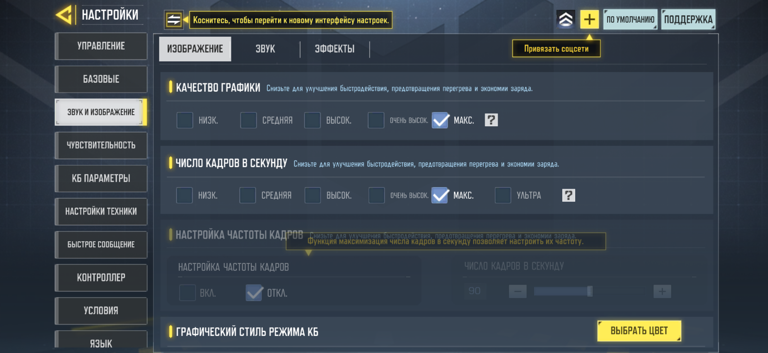 Call Of Duty Mobile работает на максимальных настройках с максимальным количеством кадров — 120 FPS. Можно поставить число кадров на значение «ультра» (настроить значение до максимума в 120 FPS), но в этом случае графика автоматически снижается до среднего показателя.