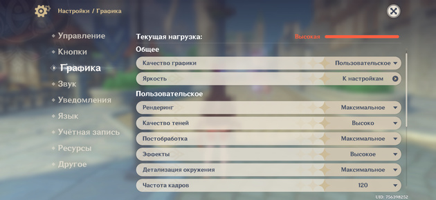 Genshin Impact идёт на максимальных настройках, здесь можно выбрать количество кадров — 120 FPS. При переключении героев, ожесточённых баталиях и смене локаций игра работает стабильно.